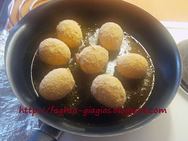 | Βάζουμε το τηγάνι με το λάδι, σε μέτρια φωτιά να ζεσταθεί και τηγανίζουμε τα αυγά γύρω - γύρω, μέχρι να πάρουν ένα ωραίο χρυσαφένιο χρώμα. Τα σερβίρουμε ζεστά ή κρύα, με ελαιόλαδο, ξύδι και αλατοπίπερο. http://faghta-giagias.blogspot.com | |