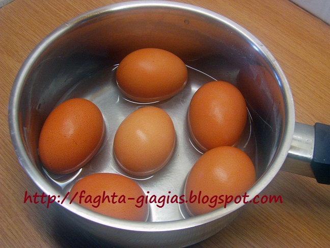 | Σ᾿ ένα μικρό κατσαρολάκι, βράζουμε όσα αυγά θέλουμε, για 12΄- 13΄ λεπτά, αν τα θέλουμε σφιχτά, ή το μισό περίπου χρόνο, για μελάτα (λεπτομέρειες Εδώ). Όταν είναι έτοιμα, τα βάζουμε σε κρύο νερό να παγώσουν για 5΄, για να μπορέσουμε να τα ξεφλουδίσουμε, πιο εύκολα. | |