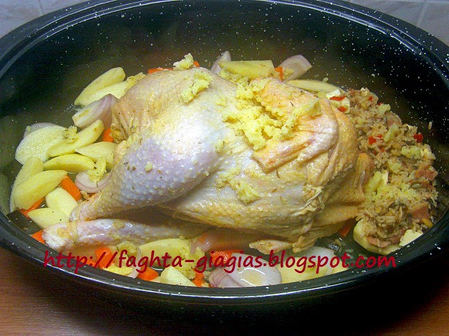| Ρίχνουμε την υπόλοιπη γέμιση σε μια άκρη, ή εναλλακτικά κόβουμε τρεις - τέσσερις πατάτες στη μέση, τις σκάβουμε μ᾿ ένα μαχαίρι και στο άνοιγμα, τοποθετούμε τη γέμιση. Αλατοπιπερώνουμε τις πατάτες, το καρότο και το κρεμμύδι και τα αραδιάζουμε πλάι στον κόκορα. Περιχύνουμε το φαγητό μας, με την μαρινάδα που είχαμε τον κόκορα. | |