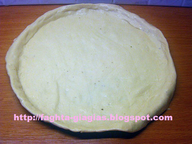 | Λαδώνουμε ελαφρά δύο ταψάκια πίτσας διαμ. 30 - 35 εκ. και ανοίγουμε το κάθε κομμάτι ζύμης, πιέζοντας με τις άκρες των δαχτύλων μας και φροντίζοντας στο χείλος του ταψιού, η ζύμη να είναι ανασηκωμένη. Παίρνουμε το κασέρι και το τοποθετούμε περιμετρικά στην άκρη του ταψιού και τυλίγουμε την περιφέρεια της ζύμης με τρόπο ώστε να καλύψουμε το τυρί και να φτιάξουμε ένα φουσκωτό στεφάνι ζύμης (κόθρο), το οποίο θα είναι γεμιστό με το κασέρι. | |