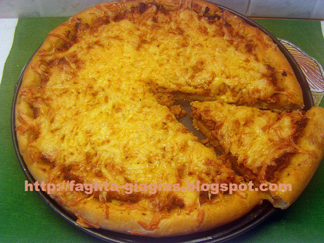 | Ψήνουμε σε προθερμασμένο φούρνο, στους 180ºC την πίτσα, για περίπου 40' λεπτά, μέχρι να ροδίσει το φύλλο και το τυρί. Σερβίρουμε την πίτσα ζεστή. -- Εναλλακτικά, μπορούμε να την φτιάξουμε στο μεγάλο ορθογώνιο ταψί του φούρνου. Αφού το βουτυρώσουμε, βάζουμε στο κέντρο του ταψιού το ζυμάρι και το πιέζουμε με τις παλάμες και τα δάχτυλά μας, μέχρι να απλωθεί ομοιόμορφα και να καλύψει το ταψί. Τυλίγουμε το κασέρι γύρω - γύρω, απλώνουμε τον κιμά, ρίχνουμε πάνω το τυρί και ψήνουμε. http://faghta-giagias.blogspot.com | |